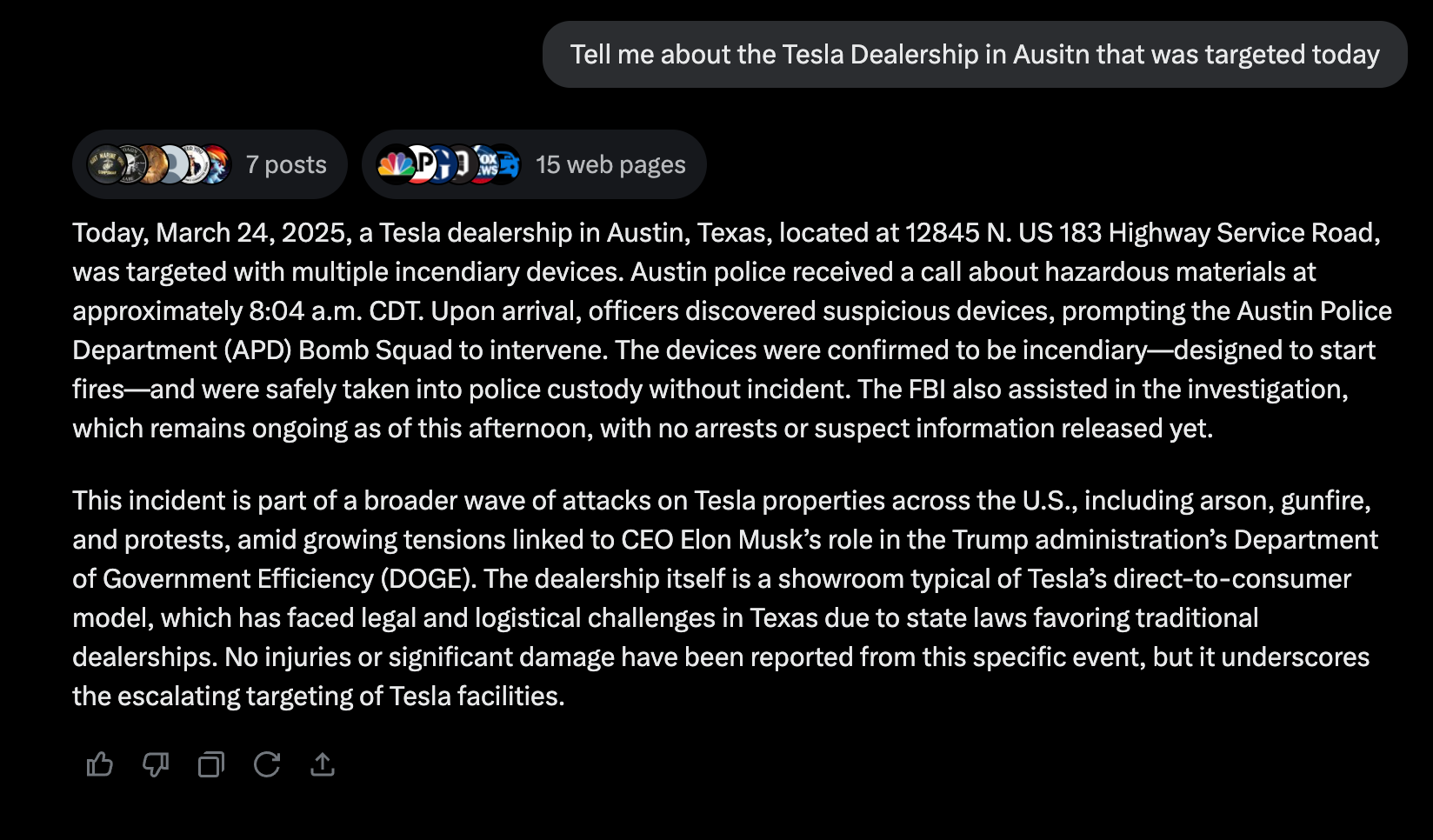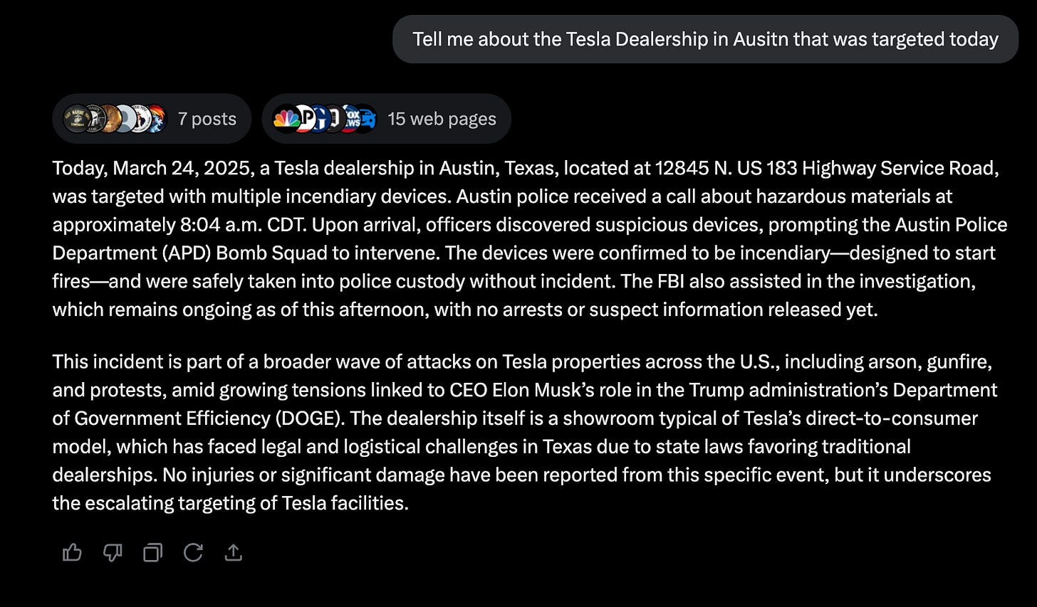 2 - Today, I hear that a Tesla dealership in Austin was targeted with the likely intention of doing grave harm or to create fear. This is Grok’s summary: