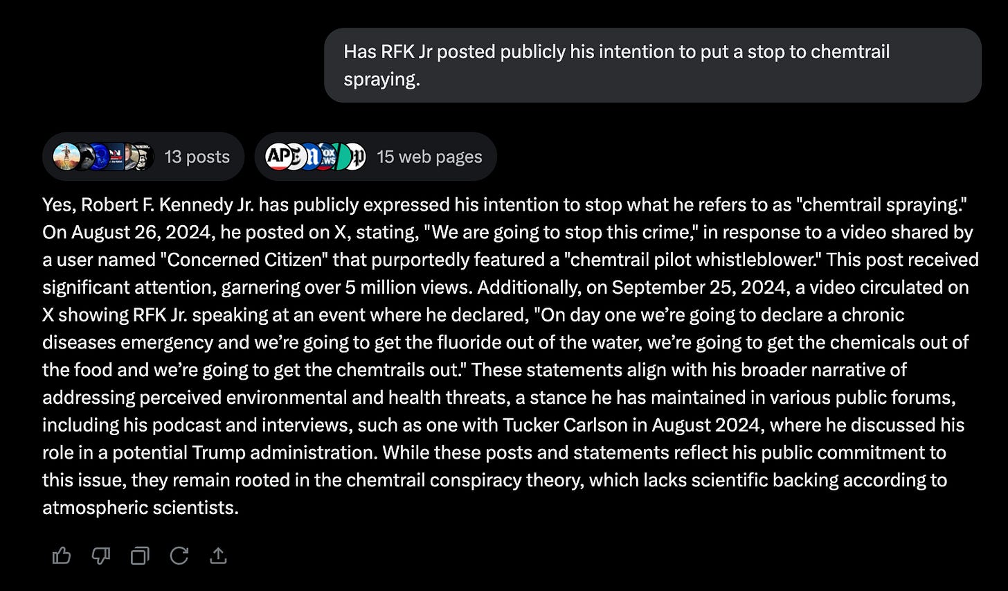 At first, I questioned Clif’s confidence with this forecast, but then, yesterday, on a podcast interview, Clif reported that he has actually seen people making plans over the “dark web”. In his opinion, if the Trump administration does not legitimately address the chemtrail problem soon, people will take things into their own hands. Do know, in case you are not aware, that RFK Jr has posted his intention to stop the spraying over our heads. Grok confirms this: